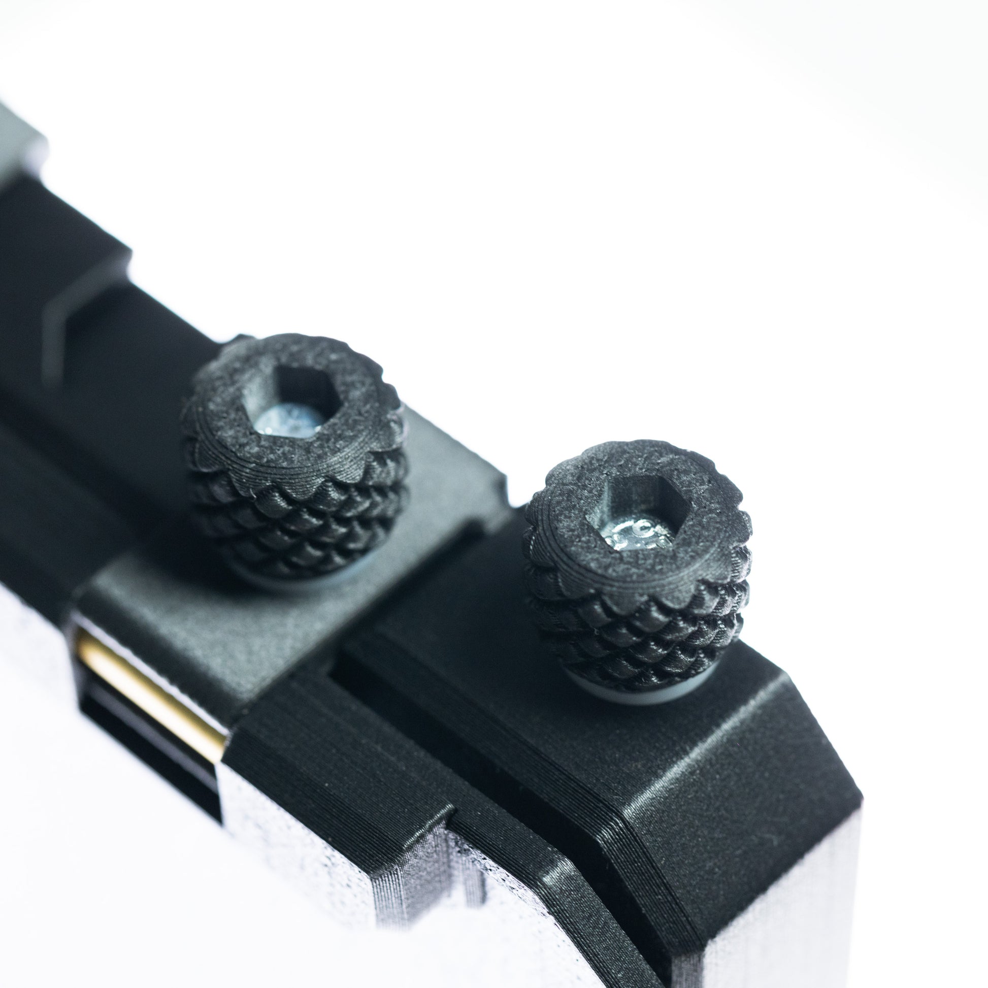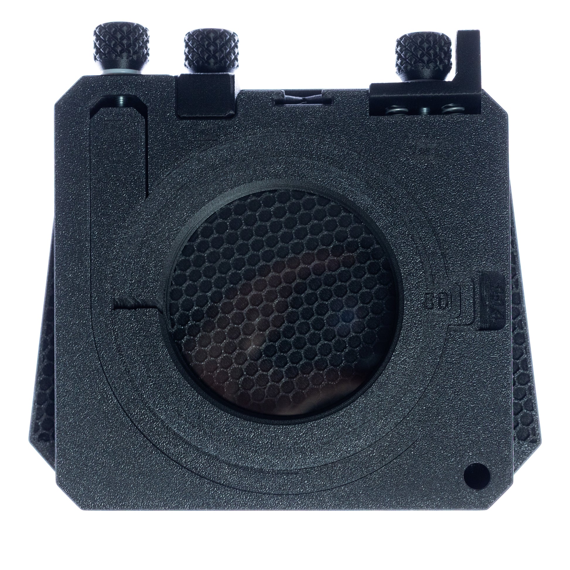 Filter clamp has two possible ways to secure filters - by adjusting the thumb screw to achieve the right position of spring loaded lever to hold the filter in position, this is useful to quickly swap filters. To fully secure filters, tighten the thumb screw.