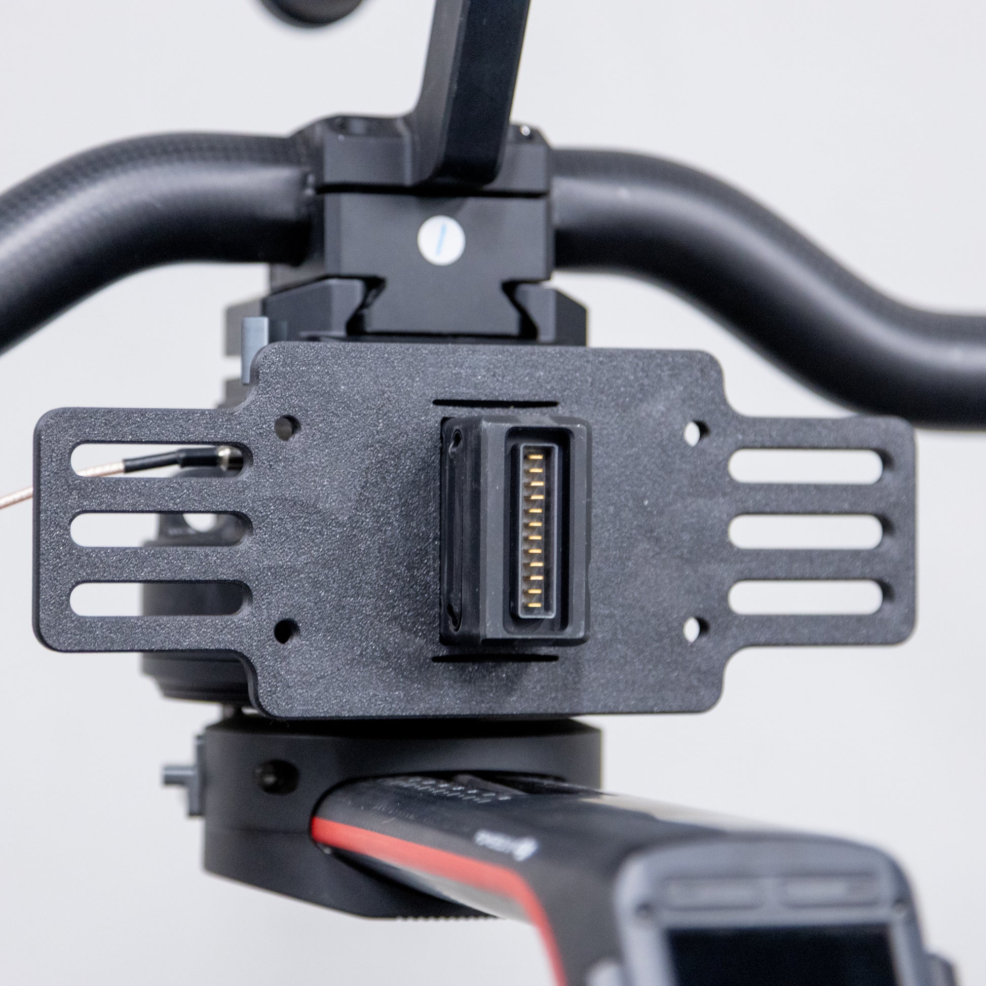 Low-profile accessory mounting. Zero rig clutter. Need to mount a wireless video transmitter to your Ronin 2 without throwing off your balance or cluttering the camera? This custom-designed accessory bracket sandwiches perfectly between the Ronin 2 battery and the main gimbal body. By utilizing the existing space behind the battery, you can keep your accessories centralized, your cable runs short, and your payload incredibly low.